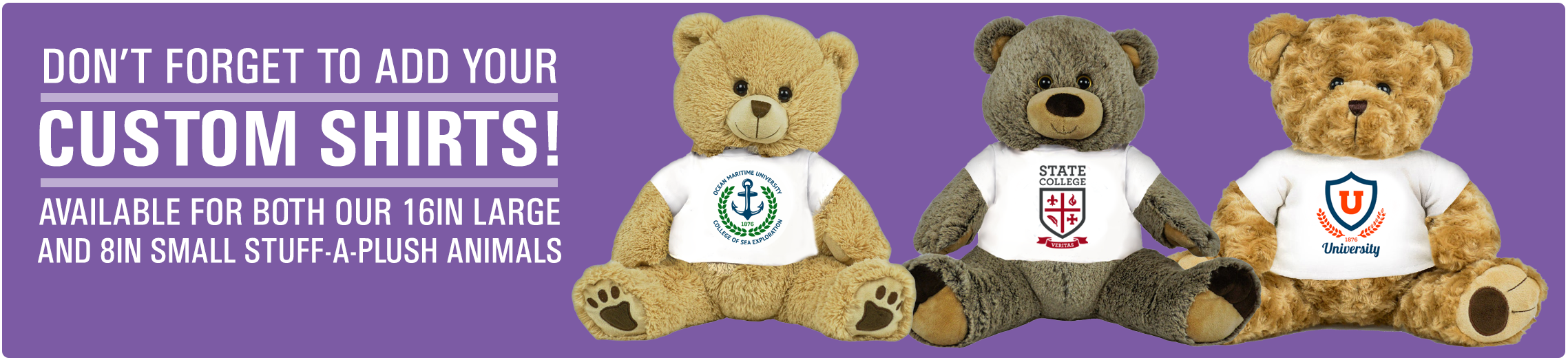 Who doesn’t love a stuffed animal to snuggle with? These are great for back to school events, homecoming or Family Weekends and Valentine’s Day is always a hit! They come with the unstuffed plush animal and a vacuum-sealed, individual packs of stuffing to make the day of event logistics a breeze! Are you looking to add a shirt with your logo or other graphic? We’ve got you covered there too!